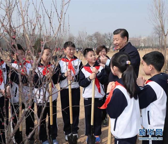 挥锹铲土填入树坑,培实新土堆起围堰,习近平接连种下白皮松、西府海棠、银杏、碧桃、榆叶梅。每种下一棵树苗,习近平都同少先队员一起提桶浇水,还不时询问他们学习生活的情况。习近平表示,我国历来就有在清明节前后植树的传统。全民义务植树的一个重要意义,就是让大家都树立生态文明的意识,形成推动生态文明建设的共识和合力。每年这个时候与同学们一起植树,感到很高兴。希望同学们从小树立保护环境、爱绿护绿的意识,既要懂道理,又要做道理的实践者,积极培育劳动意识和劳动能力,用自己的双手为祖国播种绿色,美化我们共同生活的世界。